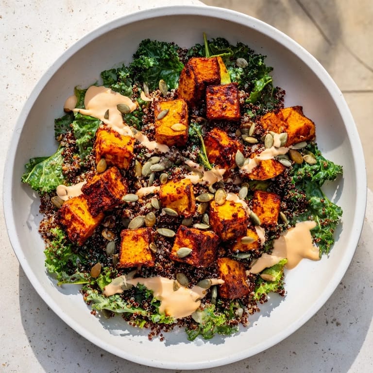 Save to Pinterest A vibrant, nourishing bowl featuring fluffy quinoa, caramelized roasted sweet potatoes, and crisp kale, finished with a zesty lemon-tahini dressing—a perfect light lunch or side inspired by coastal freshness.