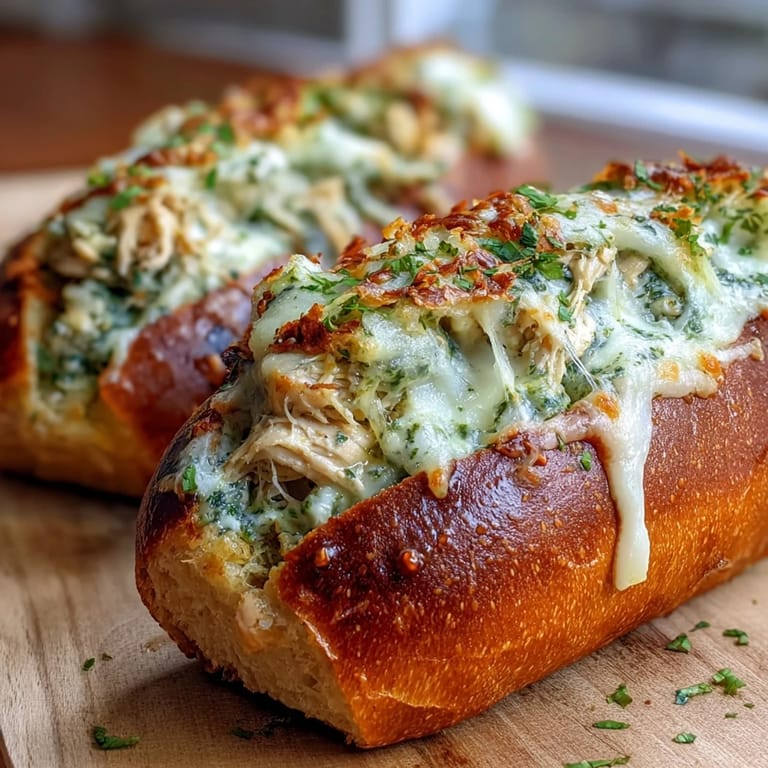 Save to Pinterest My neighbor showed up at my door one afternoon with a container of homemade pesto, apologizing for the basil explosion in her garden. I had some rotisserie chicken in the fridge and half a baguette on the counter, so we started playing around in the kitchen. Within twenty minutes, these golden bread boats emerged from the oven, cheese bubbling over the edges like something you'd see at a proper Italian restaurant. She took one bite and declared it her new favorite way to use up leftovers, and honestly, mine too.