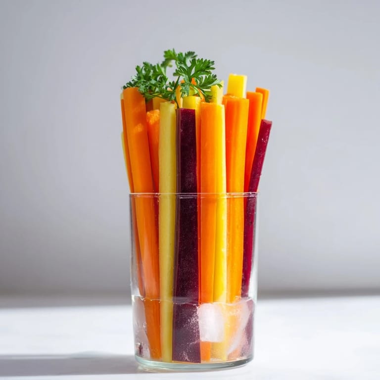 Save to Pinterest Simple Crudités: Rainbow Carrot Sticks in Tall Glasses bring a burst of color and fresh flavor to any gathering. This vibrant and healthy appetizer is perfect for parties or a light snack, showcasing a beautiful assortment of orange, yellow, purple, and red carrots arranged upright in elegant tall glasses. Served chilled and optionally garnished with fresh herbs, these crunchy sticks are as delightful to the eye as they are refreshing to the palate.