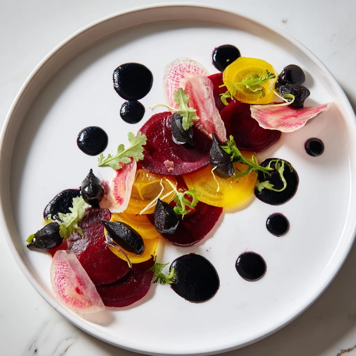 Choosing vegetables for this dish is less about availability and more about understanding what each one contributes visually and texturally. Golden beets bring warmth and sweetness, red beets bring earthiness and drama, and watermelon radishes bring that shocking moment of discovery when cut open. The blackberries and olives aren't afterthoughts—they're your visual anchors, the elements that create contrast and draw the eye through the composition. I've learned that what makes this dish work isn't perfection but intentionality; every element should be there because it serves both your eye and your palate.